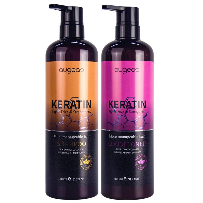 Descubre el secreto para un cabello más fuerte y manejable con el Dúo de Champú y Acondicionador de Queratina de Augeas. Diseñado para ofrecer una Solución de Queratina de Larga Duración, este set está formulado específicamente para combatir el frizz y fortalecer el cabello débil o dañado.