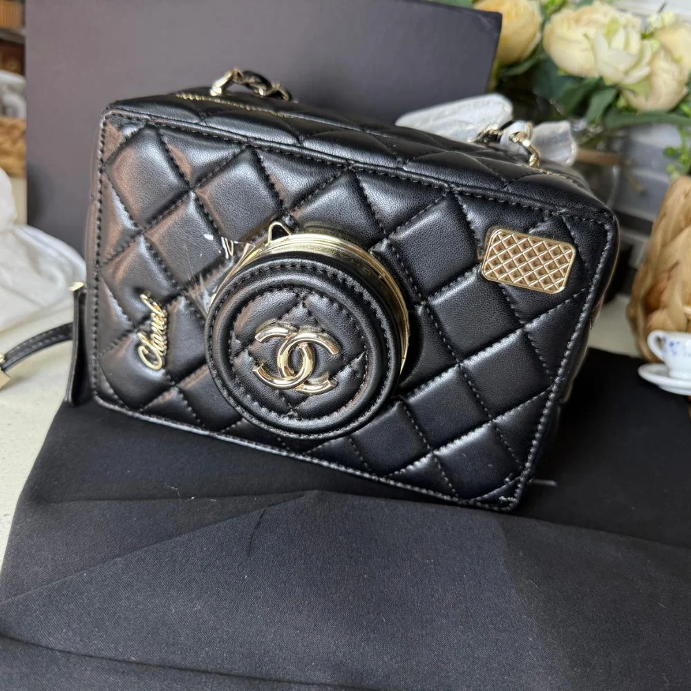 Este es un icónico y codiciado mini bolso de Chanel con un diseño que imita una cámara fotográfica. La pieza está confeccionada en piel acolchada (quilted leather) de color negro. El diseño presenta una «lente» funcional que es en realidad un espejo circular con un marco dorado, que se abre hacia un lado. El bolso está adornado con la firma «Chanel» escrita a mano en la parte inferior y presenta herrajes dorados, incluyendo una correa de cadena para llevarlo al hombro o cruzado. Es una pieza de colección que fusiona el estilo clásico acolchado de Chanel con un toque moderno y divertido.