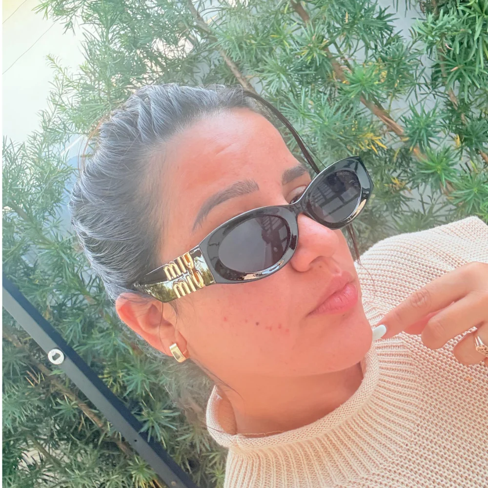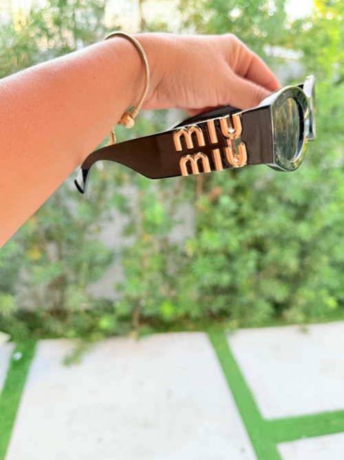 Gafas de sol de patilla ancha en negro brillante con logo dorado “Miu Miu” en relieve. Diseño moderno, llamativo y de alta calidad, con lentes oscuros. Perfectas para un look elegante y sofisticado.
