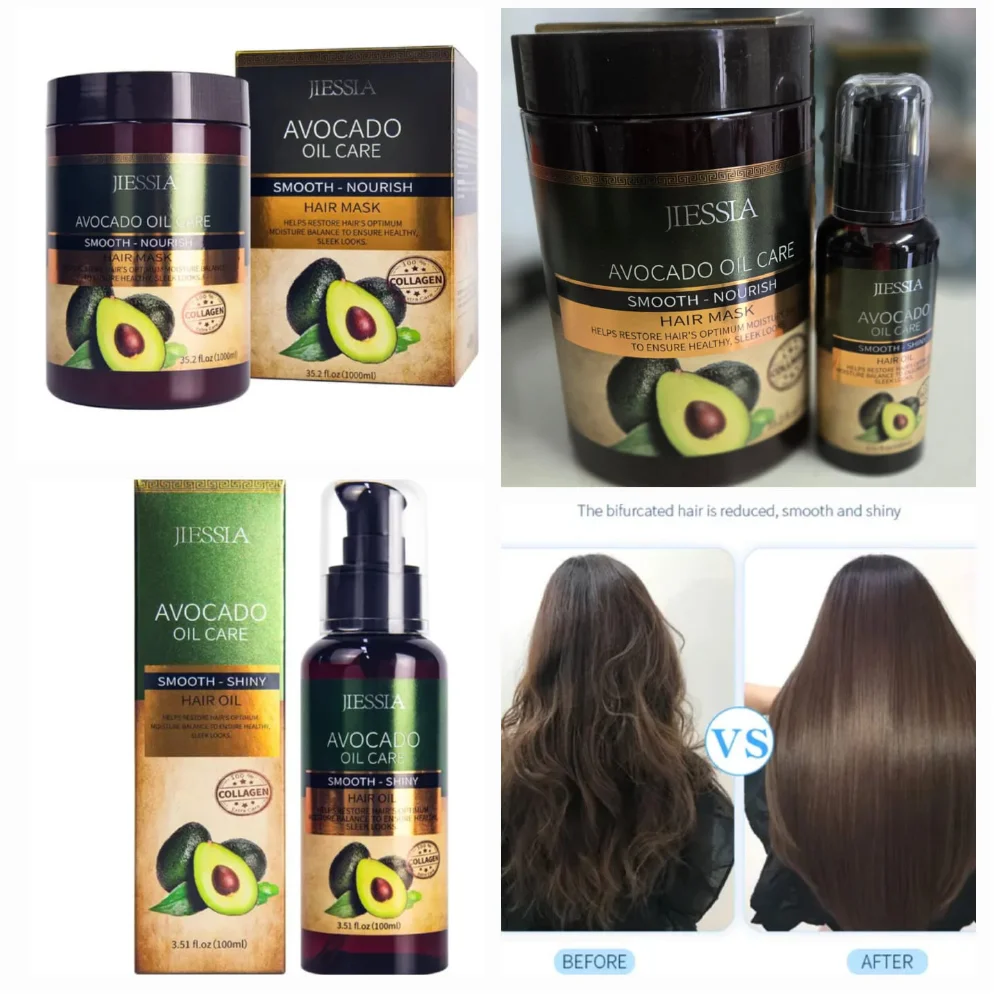 Estos son productos para el cuidado del cabello Jiessia Avocado Oil Care (mascarilla capilar y aceite capilar).
