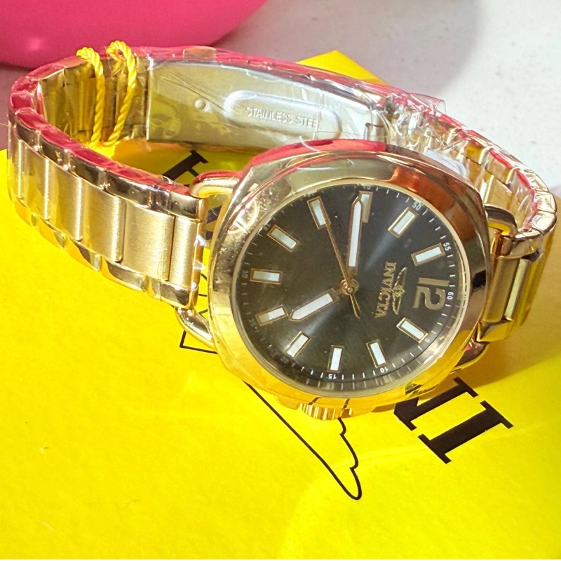 Atrévete a destacar con este singular reloj Invicta, una pieza que redefine el lujo moderno con su diseño audaz y sofisticado. Su distintiva caja redonda, pero con lados ligeramente aplanados que le dan una forma única y robusta, está bañada en un resplandeciente tono dorado que irradia opulencia. El brazalete de eslabones a juego complementa perfectamente la estética, creando una silueta armónica y llamativa. La esfera negra profunda, con un sutil patrón o acabado mate, sirve como un lienzo ideal para los índices horarios aplicados en tono dorado, que contrastan maravillosamente para una legibilidad óptima. El número 12, claramente marcado, añade un toque de distinción. Las manecillas doradas, clásicas y elegantes, completan un diseño que es tanto funcional como una declaración de estilo. Este reloj no es solo un medidor del tiempo; es un accesorio imprescindible para el individuo con carácter, que busca una pieza que combine la artesanía de calidad con una estética inolvidable, perfecta para realzar cualquier conjunto