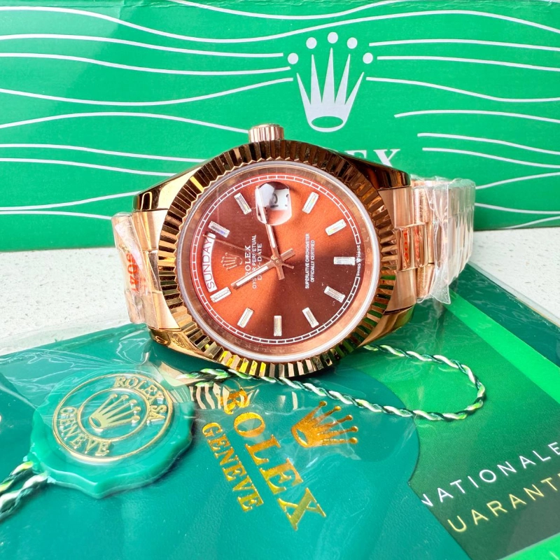 Este es un impresionante reloj de pulsera de lujo Rolex Day-Date, a menudo apodado el «President», presentado en un atractivo tono Oro Rosa (Everose). El reloj se caracteriza por su distintivo bisel acanalado y una esfera color marrón o burdeos, con indicadores de día y fecha. El brazalete a juego es del tipo President (característico de este modelo) y la caja está en excelentes condiciones, envuelta en protectores plásticos. Se presenta como un set completo, incluyendo el reloj, la bolsa/caja de presentación verde, y la carpeta de garantía internacional.
